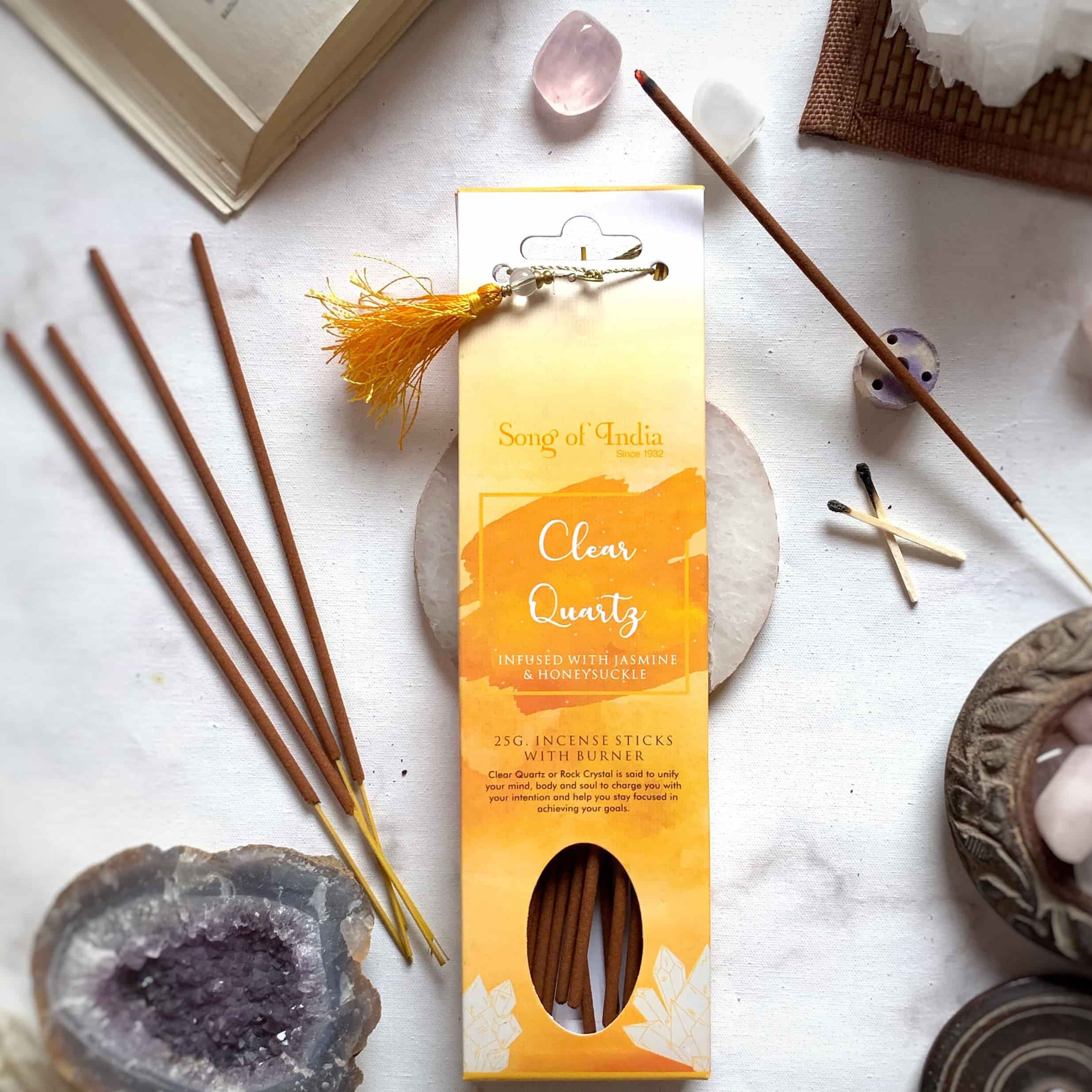 Clear Quartz Stone Infused Incense Sticks with Jasmine Honeysuckle (25g, Ceramic Burner Tassel)