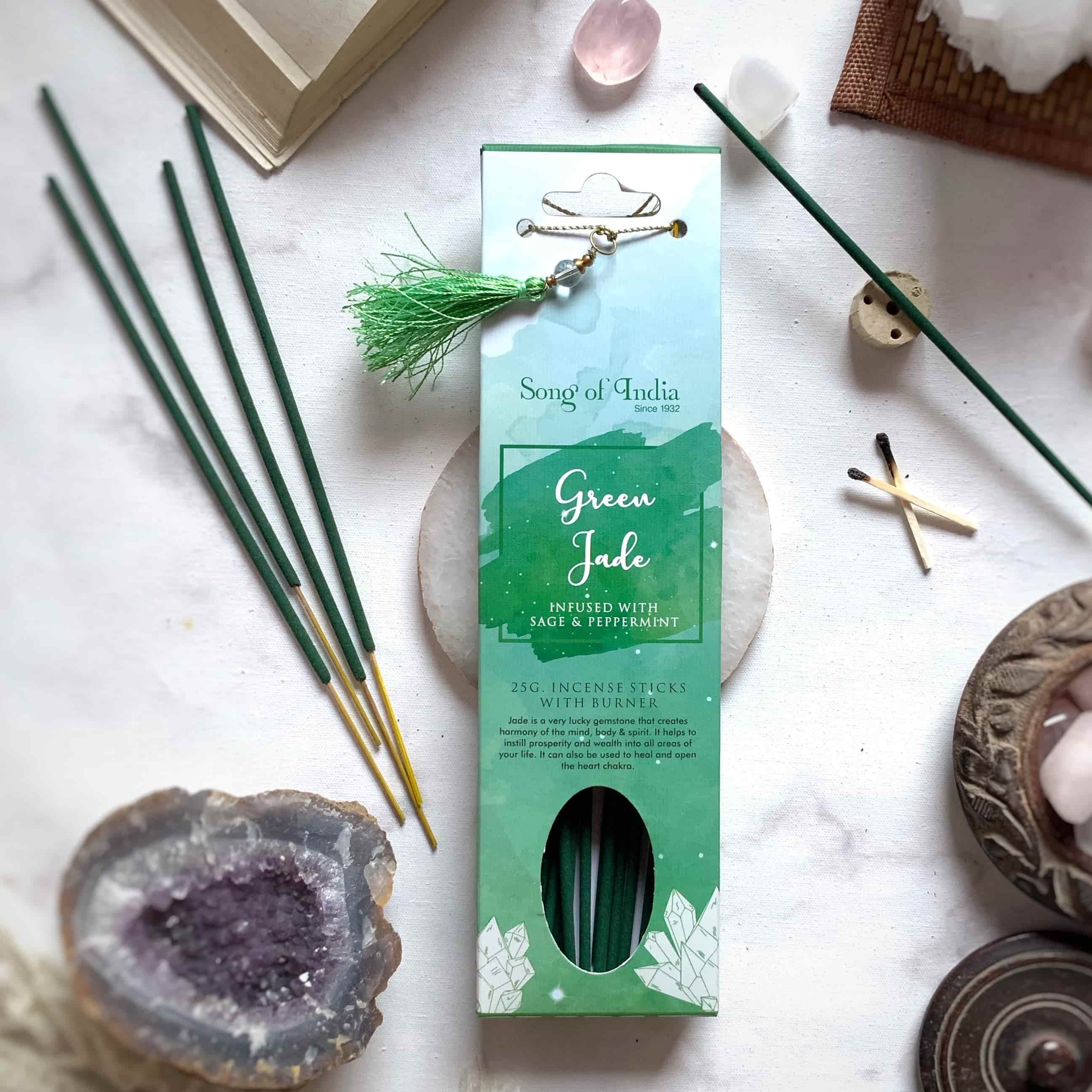 Green Jade Stone Infused Incense Sticks with Sage Peppermint (25g, Ceramic Burner Tassel)