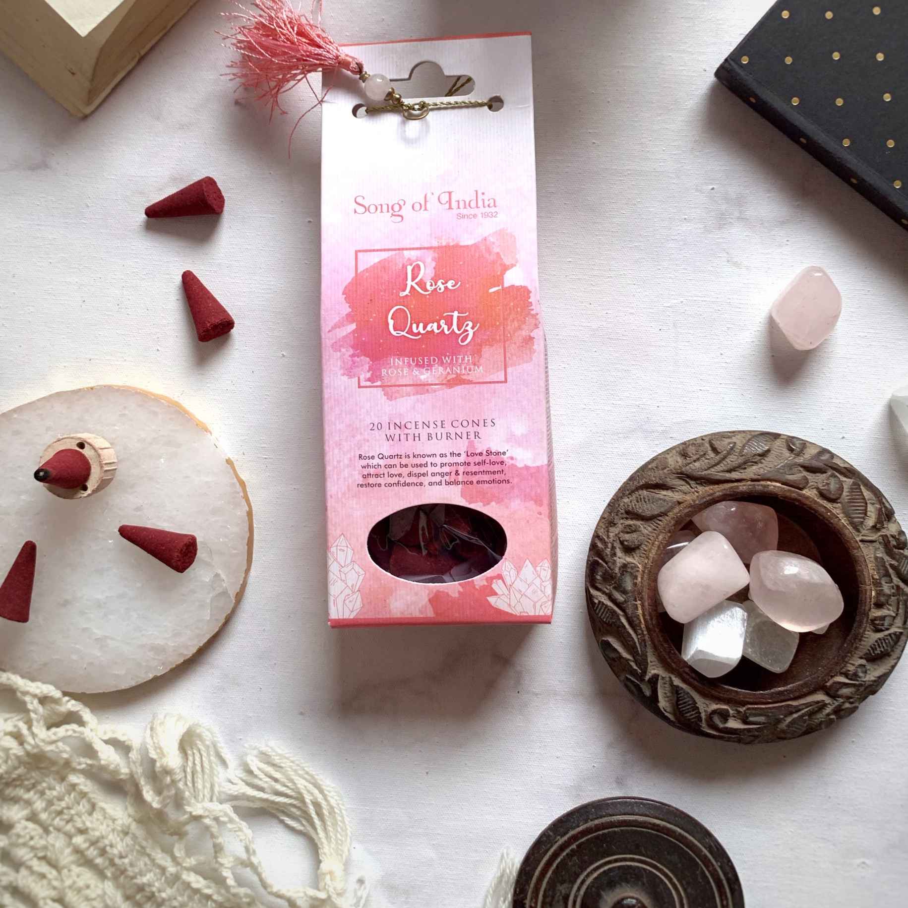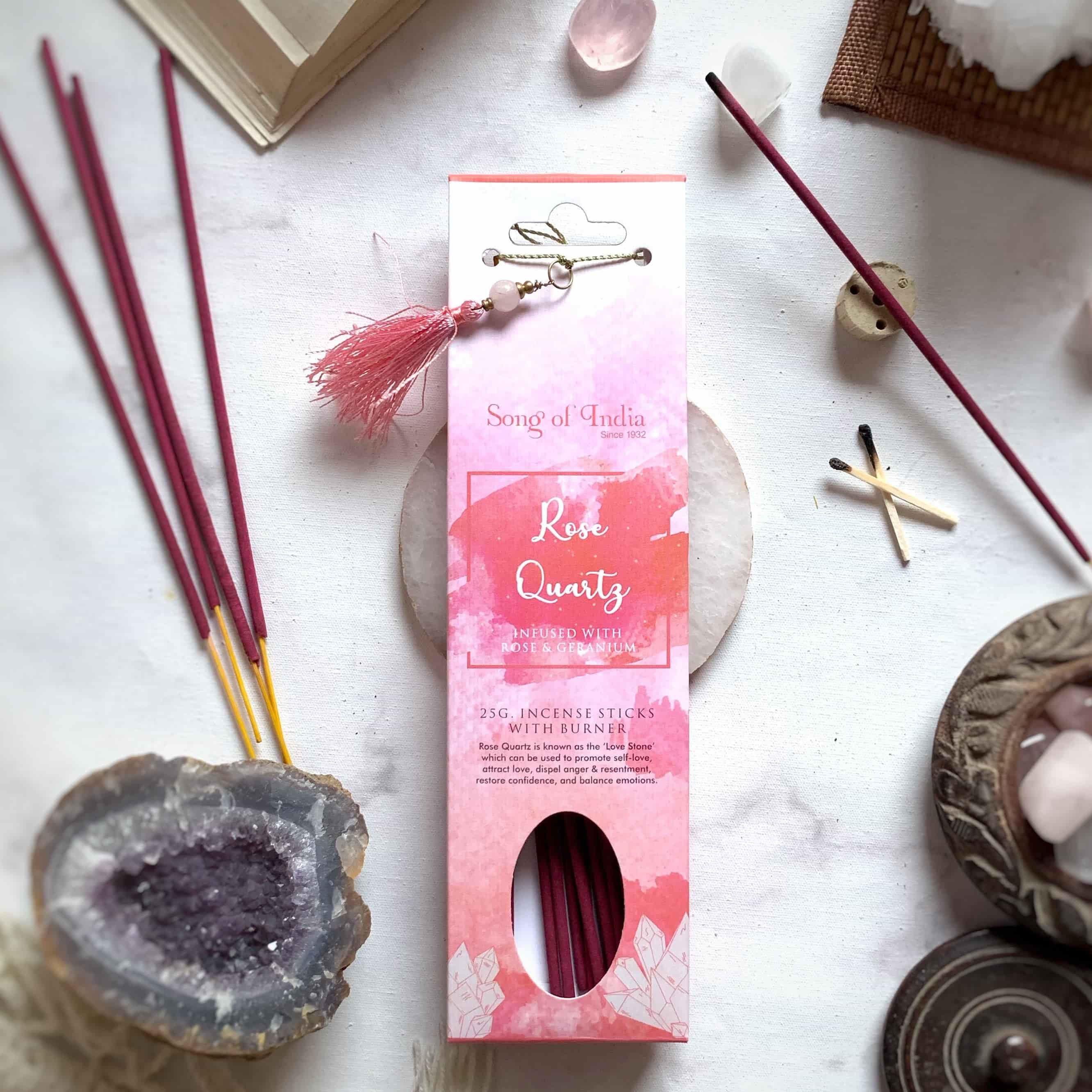Rose Quartz Stone Infused Incense Sticks with Rose Geranium (25g, Ceramic Burner Tassel)