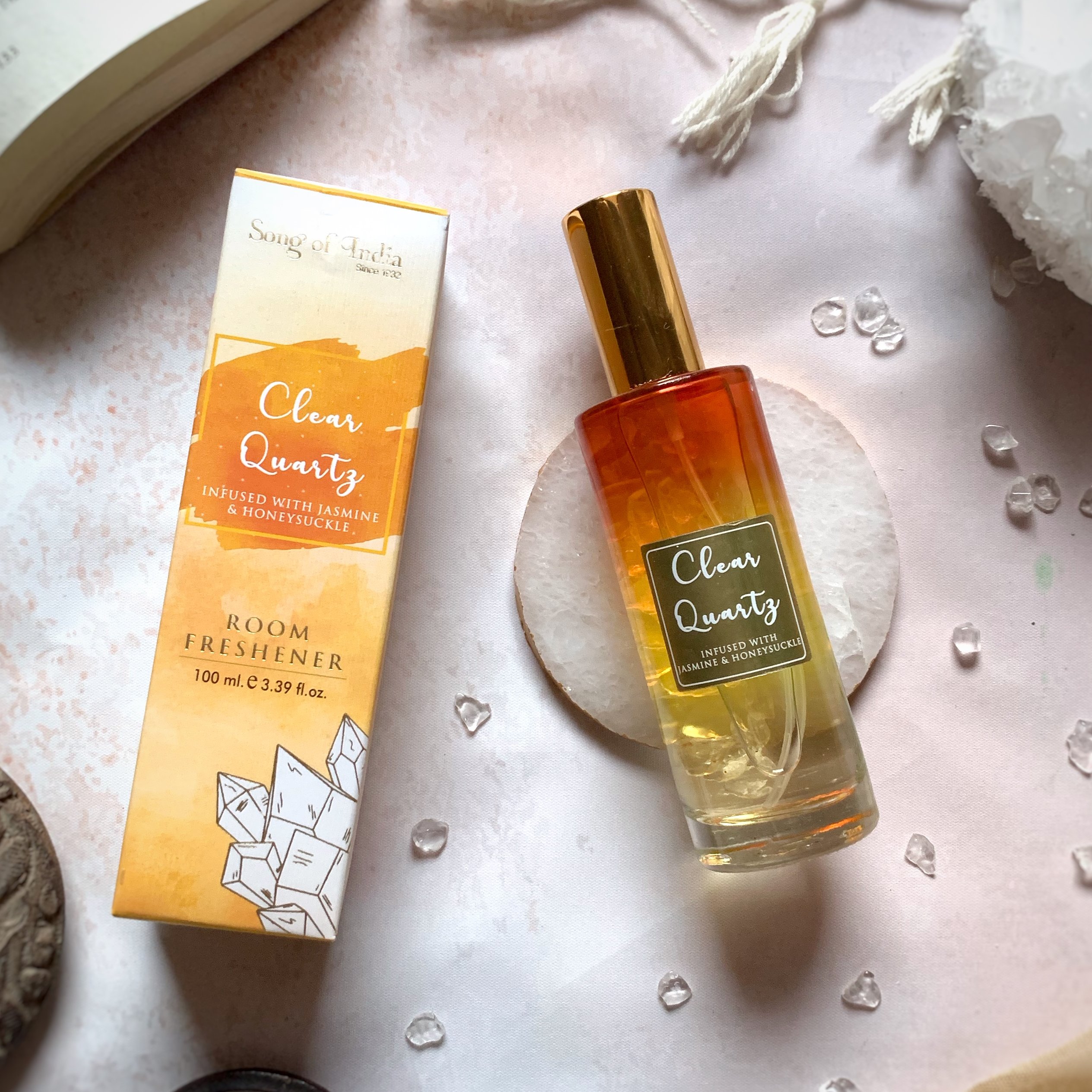 Healing Stone Room Freshener with Clear Quartz in Round Glass Bottle with Gold Pump (100ml)