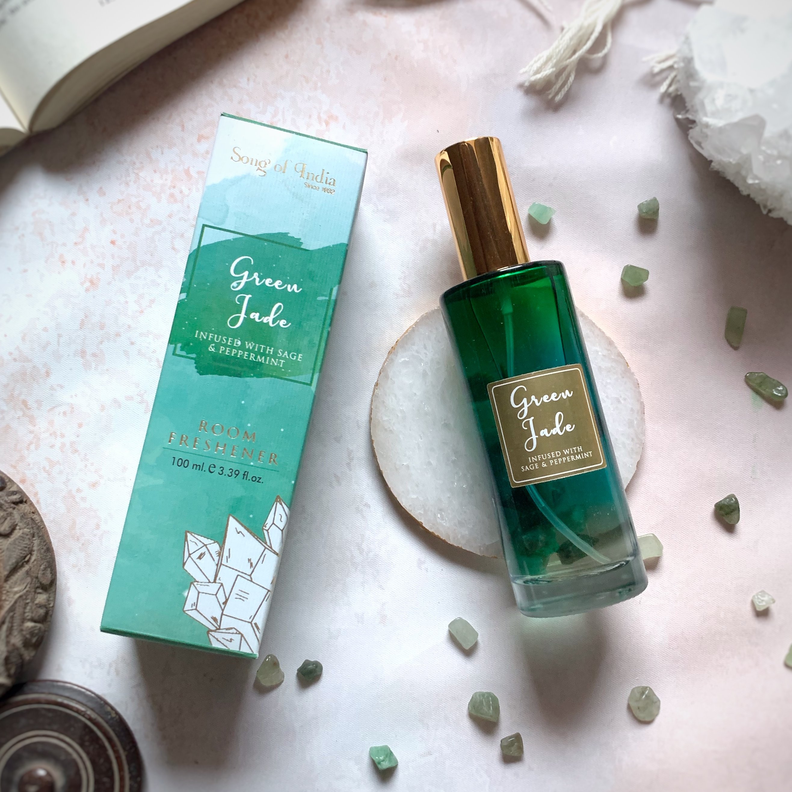 Healing Stone Room Freshener with Green Jade in Round Glass Bottle with Gold Pump (100ml)