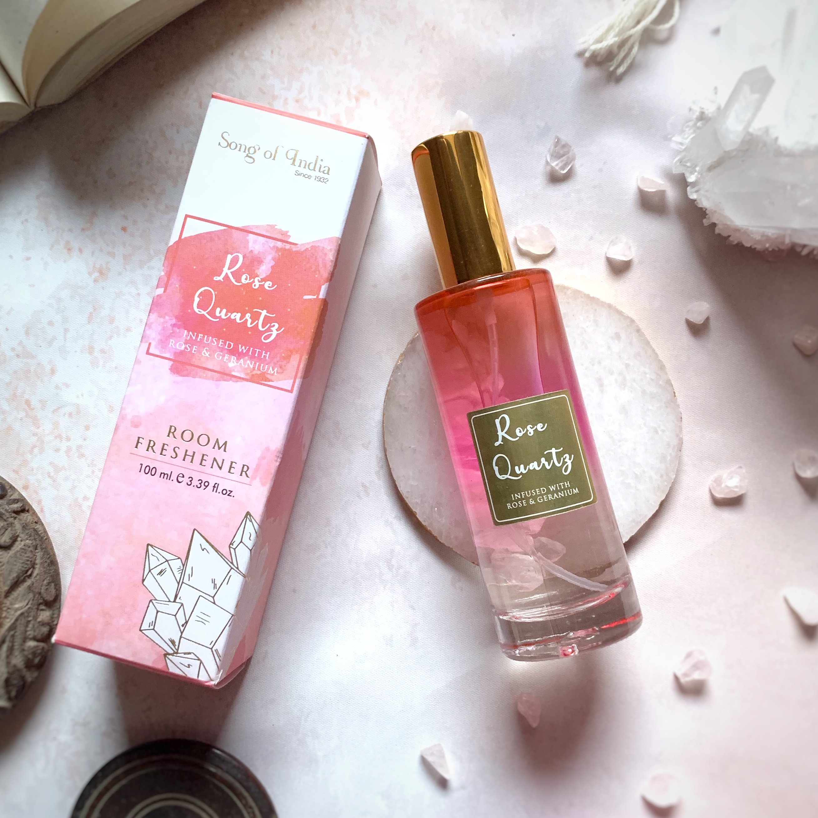 Healing Stone Room Freshener with Rose Quartz in Round Glass Bottle with Gold Pump (100ml)